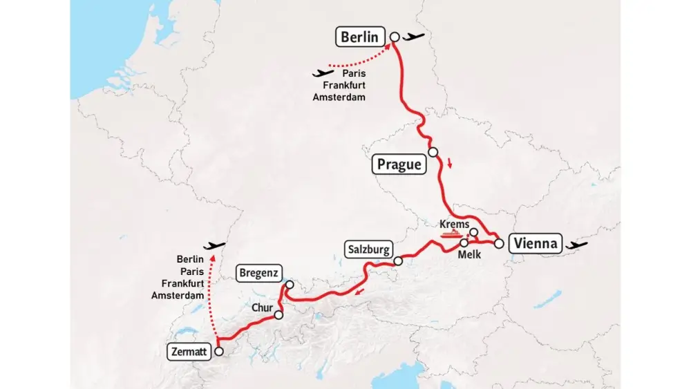 Berlin, Prague, Vienna, Salzburg, Bregenz, Zermatt